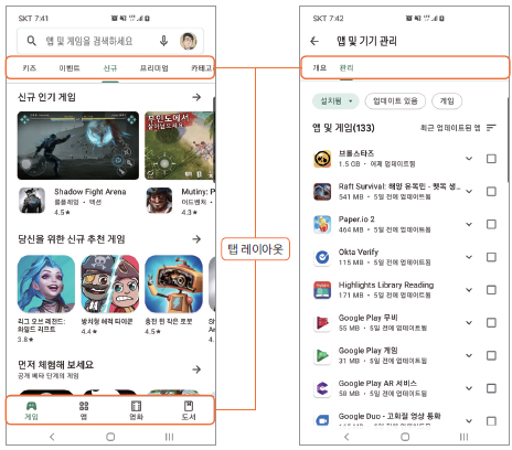 다음 그림은 Play 스토어 앱의 화면입니다. 상자로 표시한 부분에 탭 버튼이 사용되었습니다.