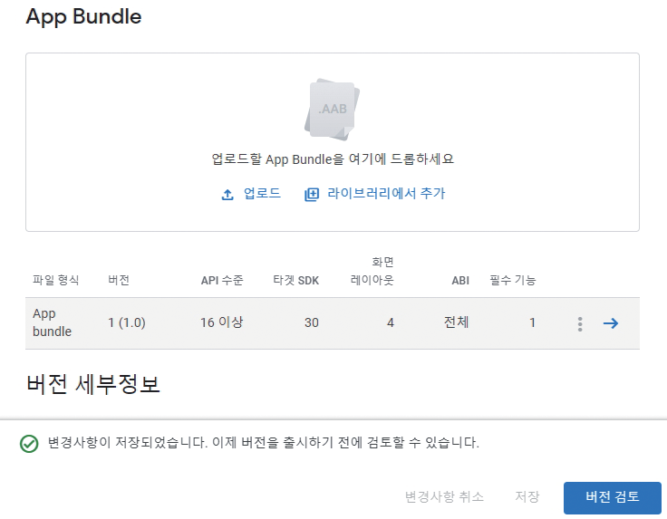AAB 파일을 업로드하고 버전 세부정보와 출시 노트를 작성한 후, <저장> 버튼을 누르면 <버전 검토>