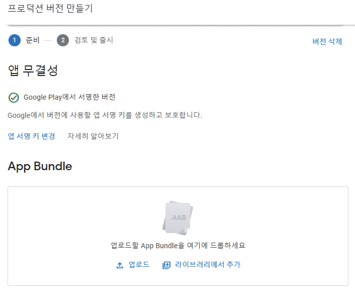 위의 화면에서 '새 버전 만들기'를 클릭해 AAB 파일을 등록해봅시다.