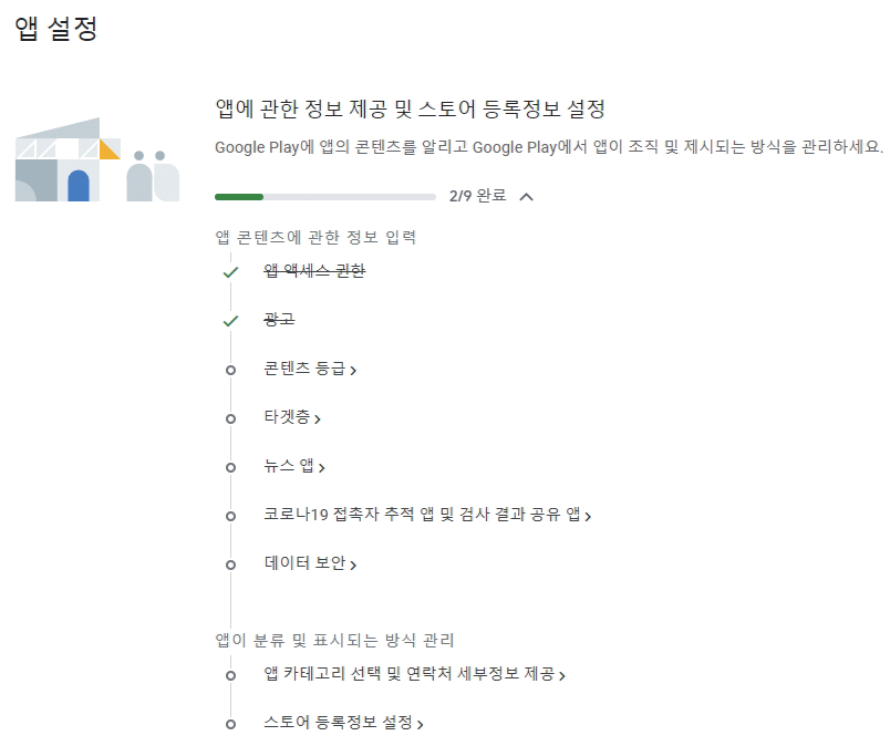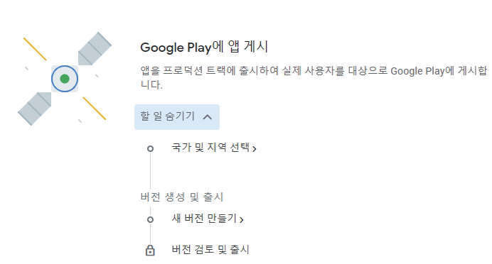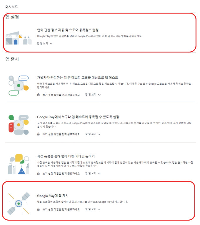 이 대시보드에서 '앱 설정'의 [앱에 관한 정보 제공 및 스토어 등록정보 설정]과 '앱 출시'의 [Google
