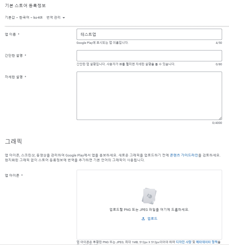 - 앱 아이콘 이미지: 구글 Play 스토어에 사용할 앱 이미지. 512×512px 크기의 1MB 미만 JPEG 또는 32비트 PNG 파일