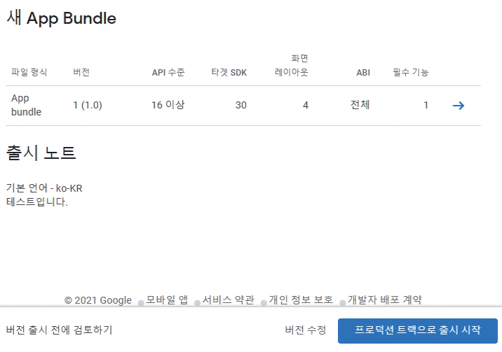 이제 버전을 출시할 준비가 완료되었습니다. 마지막으로 아래 화면에서 <프로덕션 트랙으로 출시 시작>