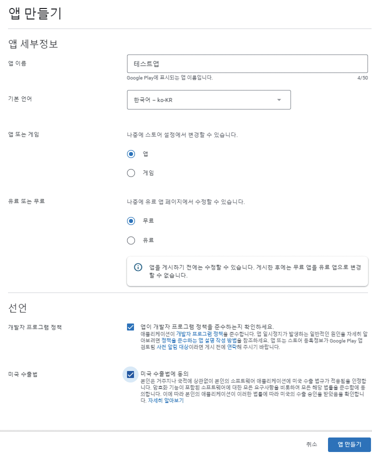 앱 만들기 화면에서 앱 이름, 기본 언어, 앱 또는 게임, 유로 또는 무료 정보를 입력한 후에 약관에