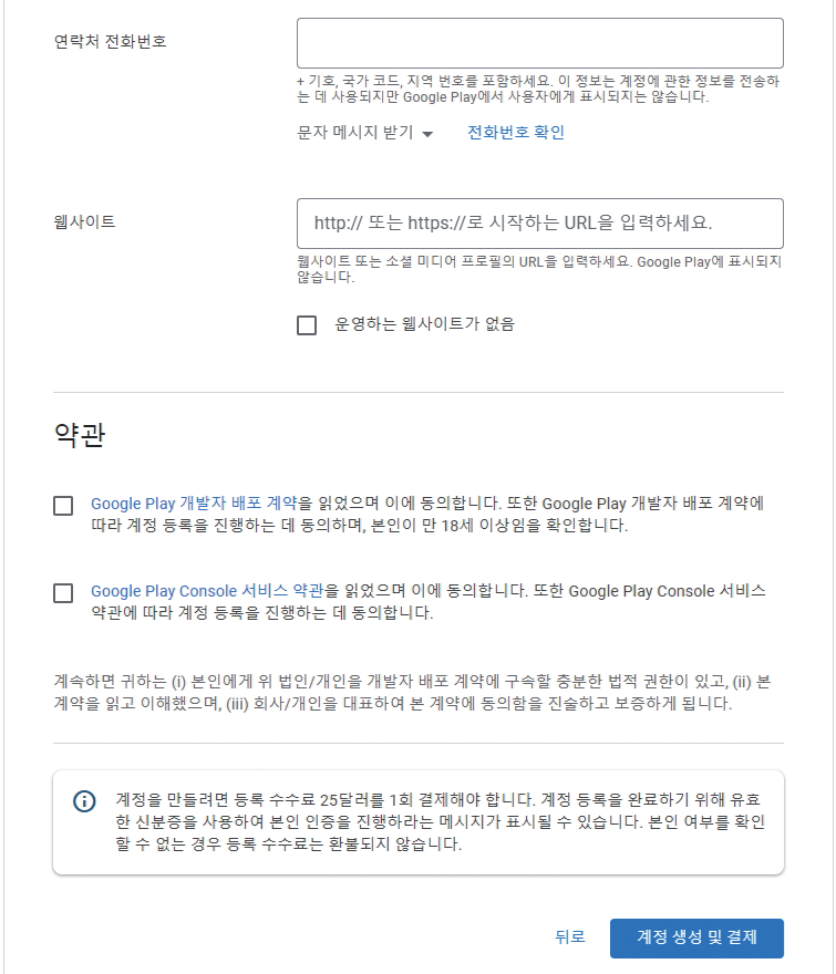 개발자 계정을 만들기 위해서는 몇 가지 정보를 입력해야 합니다. 이때, 전화번호는 국가 번호를 포함해