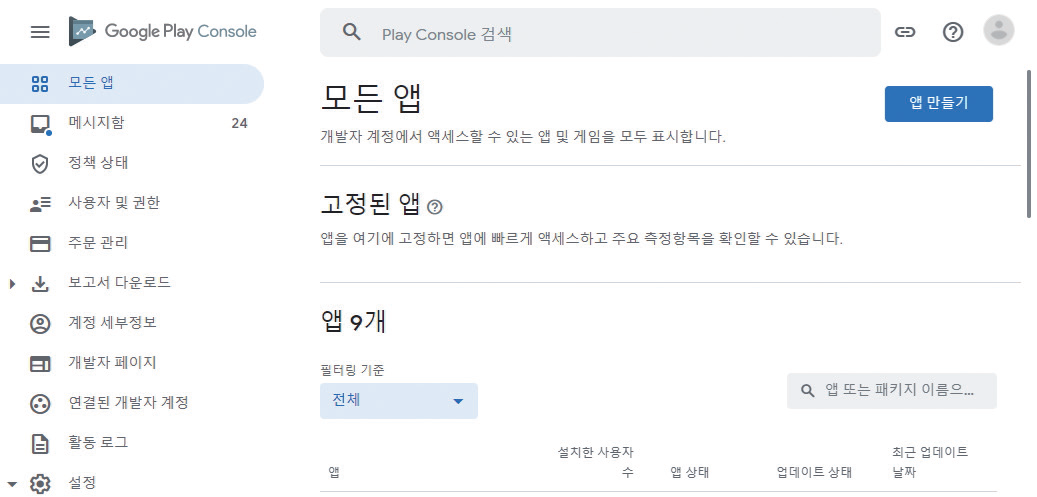 개발자로 등록이 끝나면 다음 그림처럼 구글 Play 콘솔에 접근할 수 있으며, 이곳에서 앱을 등록하거나