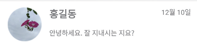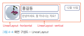 그림처럼 항목을 구성해야 한다면 프로필 사진을 위한 ImageView와 이름, 내용, 날짜를 위한