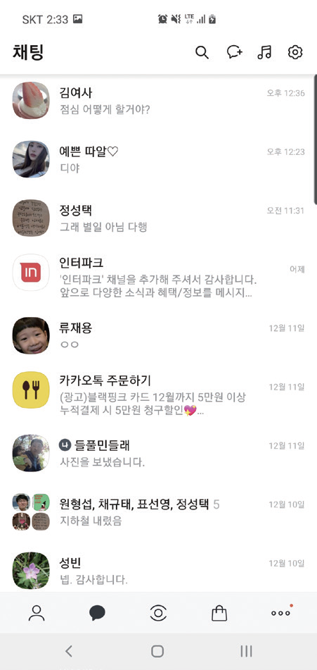 카카오톡 목록 화면 전체를 구성하려면 이번 장의 내용만으로는 불가능하고, 이후 살펴볼 RecyclerView의 Adapter라는 기능을 추가로 알아야 합니다. 이 부분은 이후에 다루고, 이번에는 위의 목록 화면에서