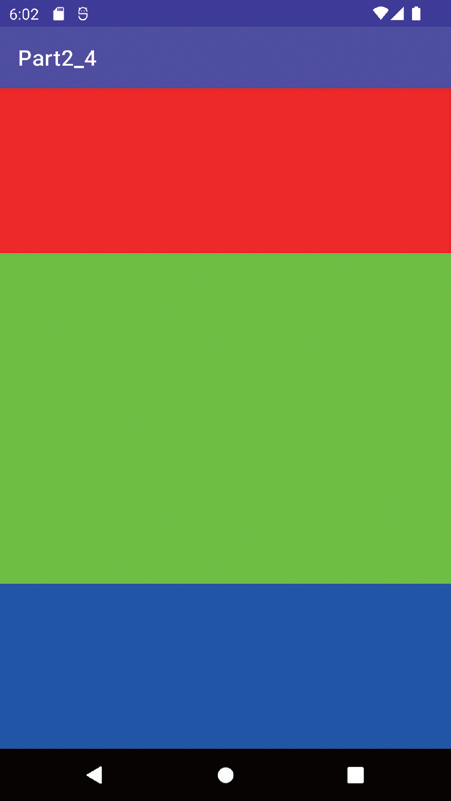 각 뷰의 layout_weight 값을 1, 2, 1로 지정하였는데, layout_weight 값은 절대적 수치가 아닌 상대적으로 계산되는 값입니다. 모든 weight 값을 더해서 등분으로 계산됩니다. 즉, 1, 2, 1로 지정하였으므로 전체를 더하면 4가 되고, 첫 번째 TextView가 1/4, 두 번째 TextView가 2/4, 세 번째 TextView가 1/4의 여백을 차지하게 됩니다.