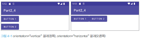 버튼은 세로 방향으로 나열됩니다. 만일, orientation 속성을 "horizontal"로 바꾸어 테스트하면 버튼