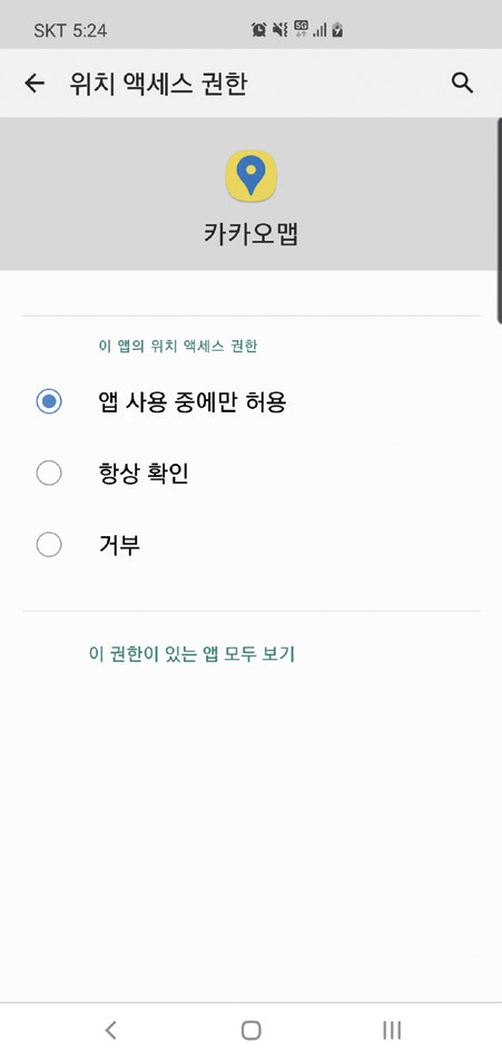 그림은 카카오맵의 권한 화면입니다. 사용자가 앱의 퍼미션을 확인하는 것뿐 아니라, 직접 조정할
