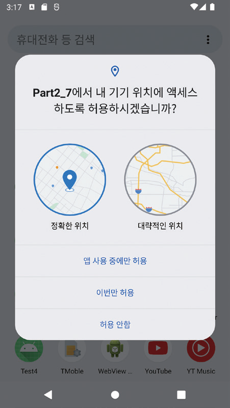 퍼미션이 부여되지 않았다면 앱 내부에서 대화상자를 띄워 퍼미션 허용을 요청해야 합니다. 코드로 직접