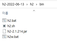 압축해제한 곳에 보면 bin 폴더가 있고 그 안에 H2 데이터베이스를 실행시킬 수 있는 파일이 있습니다.