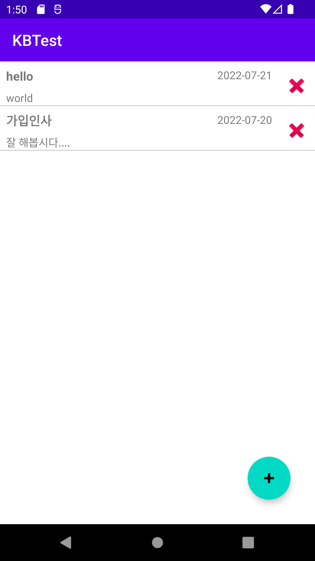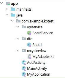 테스트 앱은 화면 두개로 구성됩니다. MainActivity 는 서버의 데이터를 받아 목록 화면을 구성하게 되며 AddActivity 는 새로운 게시글 입력 및 수정 화면을 구성하게 됩니다.