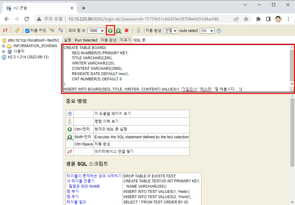 INSERT INTO BOARD(SEQ, TITLE, WRITER, CONTENT) VALUES(1, '가입인사', '테스터', '잘 해봅시다....');