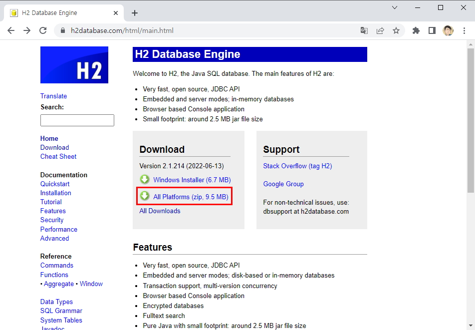 H2 데이터베이스는 쉽게 다운로드 받아 설치가 가능합니다.
