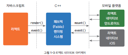 앱을 실행할 때 각 플랫폼의 자바스크립트 런타임이 자바스크립트 코드를 실행해 플랫폼별 네이티브 코드와 연동하는 구조입니다. 개발자가 네이티브 코드를 직접 작성하지는 않지만 화면과 이벤트 처리 등은 플랫폼에 종속된 네이티브 코드로 처리됩니다. 개발자는 자바스크립트 코드만 작성하면 되므로 안드로이드와 iOS 앱을 똑같이 작성할 수 있습니다.