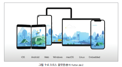 모바일 앱을 개발하는 기술은 여러 가지가 있습니다. 안드로이드와 iOS 앱은 각 플랫폼에서 제공하는 기술을 이용해 개발하지만 이 책에서 살펴보고자 하는 플러터Flutter는 크로스 플랫폼에서 동작하는 앱을 만드는 기술입니다. 즉, 안드로이드와 iOS는 물론이고 윈도우, macOS, 리눅스, 웹, 임베디드 등 여러 플랫폼에서 동작하는 앱을 같은 코드로 개발할 수 있습니다.