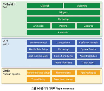 플러터의 아키텍처에서 애플리케이션 개발과 밀접한 부분은 다트 언어로 개발된 프레임워크입니다. 앱을 개발할 때는 이 프레임워크에서 제공하는 다양한 API를 이용합니다.