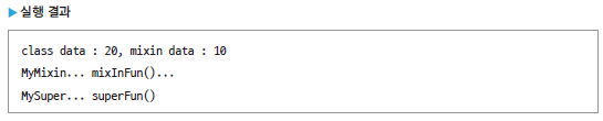 이렇게 보면 믹스인과 클래스는 별 차이가 없는 것 같습니다. 그러나 클래스는 객체를 생성할 수 있지만, 믹스인은 객체를 생성할 수 없습니다. 결국 믹스인은 독립적으로 이용할 수 없으며 다른 클래스에서 공통으로 사용할 변수나 함수를 믹스인에 담아 두고 필요한 클래스에서 with로 연결해서 사용합니다.