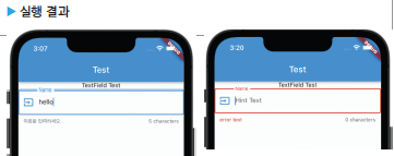 errorText는 사용자 입력 오류처럼 오류가 발생할 때 출력할 문자열입니다. errorText를 지정하면 텍스트 필드의 테두리는 자동으로 빨간색이 되며 helperText에 지정한 문자열은 출력되지 않습니다. 다음 코드에서 주석을 해제하면 예제 아래 실행 결과에서 오른쪽 화면처럼 나옵니다.