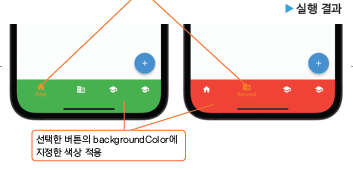 다음 코드에서는 하단 내비게이션 바를 버튼 4개로 구성한 예인데, 배경색을 각각 다르게 지정했습니다. 첫 번째 버튼을 선택하면 하단 내비게이션 바의 전체 배경색이 녹색이 되며, 두 번째 버튼을 선택하면 빨간색이 됩니다.