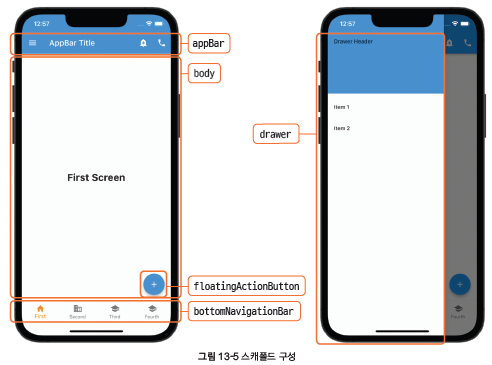 스캐폴드(Scaffold)는 앱 화면의 골격을 제공하는 위젯입니다. 앱의 화면 상단에 타이틀, 메뉴 아이콘 등을 출력하는 앱바, 화면 하단에 탭 버튼, 화면 오른쪽 아래에 둥근 버튼, 화면 왼쪽이나 오른쪽 가장자리에서 열리는 드로어 등을 포함할 수 있습니다. 이런 화면의 기본 골격을 스캐폴드 위젯으로 구성할 수 있습니다.