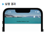 다음은 화면 상단에 앱바 영역을 구성한 예입니다. 타이틀 문자열, 하단 구성 요소, 액션 버튼 등을 추가할 수 있습니다.