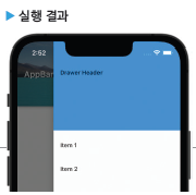 drawer는 화면에 보이지 않다가 왼쪽이나 오른쪽에서 밀면 나타나는 드로어를 설정하는 속성이며, 보통은 Drawer 위젯으로 구성합니다. 드로어를 어떻게 구성할 것인지는 개발자 마음이지만 보통은 사용자에게 이벤트를 받는 항목을 나열할 목적으로 사용합니다. 그래서 드로어를 리스트 뷰로 구성합니다. 또한 필요하다면 DrawerHeader 위젯으로 리스트 뷰의 항목 윗부분을 다양하게 꾸밀 수도 있습니다.