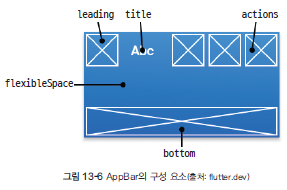 appBar는 화면 상단에 앱바를 설정하는 속성이며 여기에는 보통 AppBar 위젯을 적용합니다. AppBar 위젯에는 다음처럼 다양한 구성 요소를 설정할 수 있습니다.