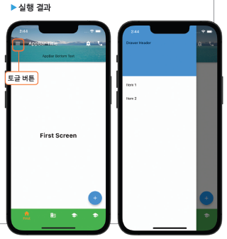 스캐폴드에 드로어를 추가하면 AppBar 왼쪽에 자동으로 토글 버튼이 나오며 이 버튼으로 드로어가 화면에 나타나게 할 수 있습니다. 물론 토글 버튼을 누르지 않고 사용자가 화면 가장자리를 밀어서 나타나게 할 수도 있습니다.