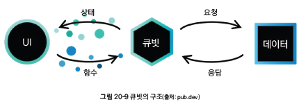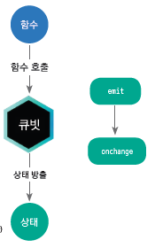 오른쪽 그림은 큐빗의 흐름을 나타냅니다. 큐빗의 함수가 호출되면 업무 로직이 실행되고 상태를 내보냅니다. 그러면 내부적으로 onChange() 함수가 자동으로 호출되어 상탯값 변경 정보를 전달해 줍니다.