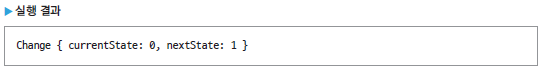 큐빗에는 개발자 함수 외에도 onChange() 함수를 재정의할 수 있습니다. 이 함수는 어디선가 emit() 함수로 상태를 내보내면 자동으로 호출됩니다. onChange() 함수의 매개변수인 Change 객체를 이용해 이전 상탯값과 변경된 상탯값을 정보로 얻을 수 있습니다. 앞의 코드처럼 실행하여 어디선가 increment() 함수를 호출하면 onChange()의 print() 함수가 다음처럼 출력합니다.