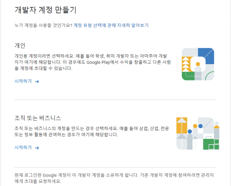 계정으로 로그인하고 구글 Play 스토어에서 '개발자 계정 만들기'를 진행합니다. 아래 화면에서 "개인"
