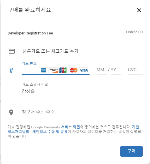 신용카드 정보를 입력하는 화면이 나오면 적절한 결제 정보를 입력합니다. 개발자 등록에 드는 비용은